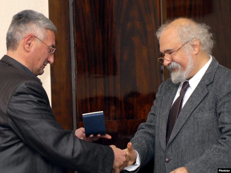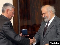 Директор Национальной библиотеки Армении Давид Саргсян вручает турецкому издателю и правозащитникк Рагипк Зараколу медаль имени Акопа Мегапарта, Ереван, 15 февраля 2011 г.