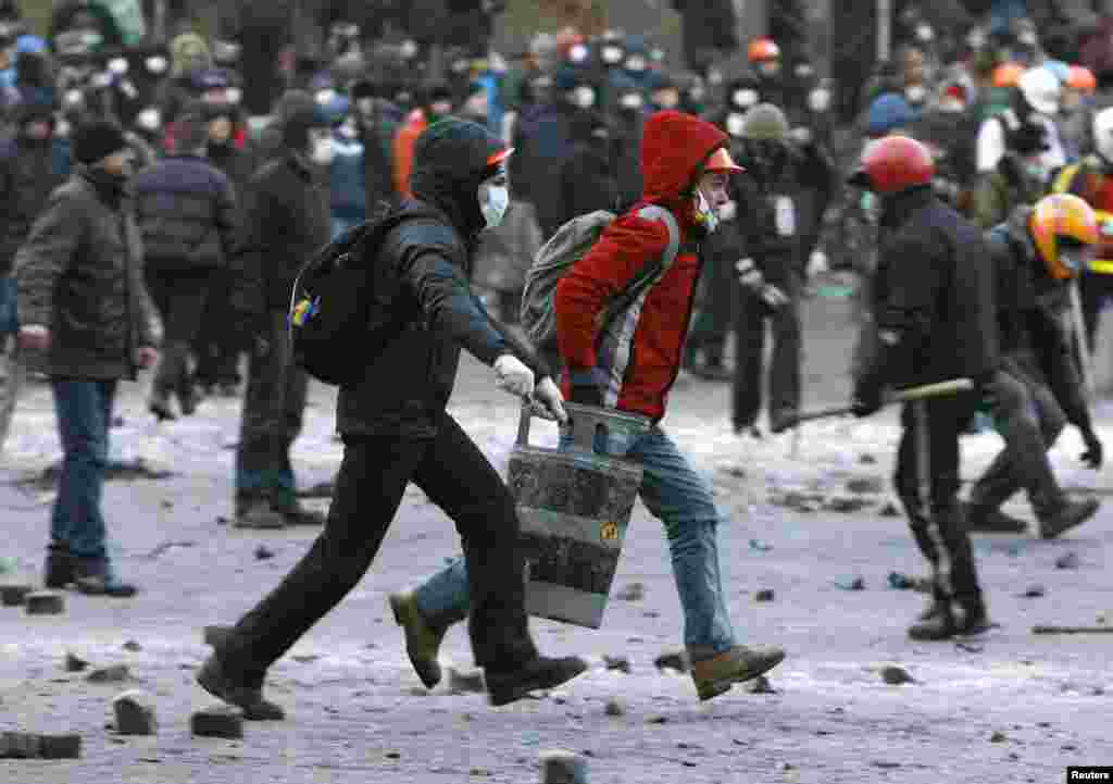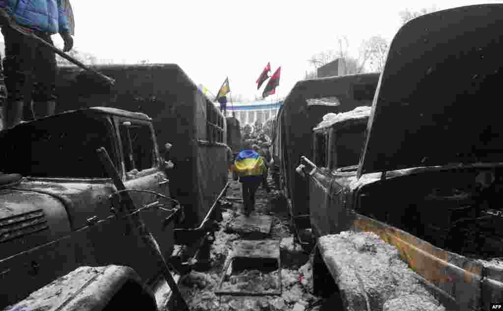 В центре Киева на улице Грушевского милиция сегодня утром оттеснила демонстрантов от первой линии возведённых ими баррикад и начала разбирать их. В ответ манифестанты забросали бойцов «Беркута» камнями и бутылками с зажигательной смесью, что заставило милицию отступить, сообщают информационные агентства.