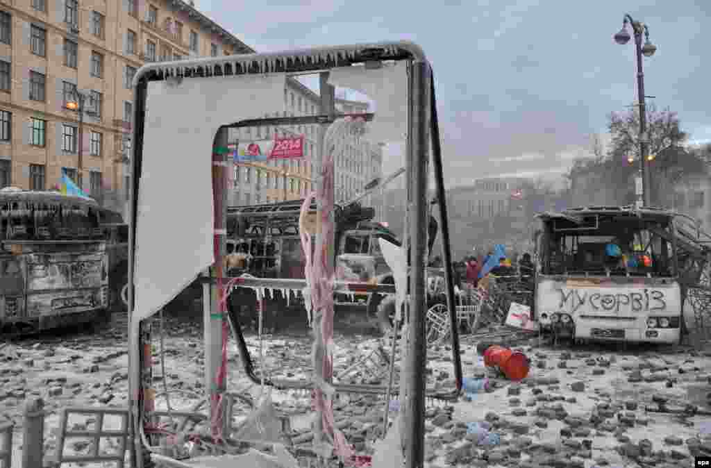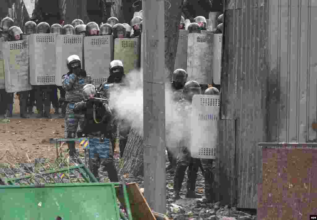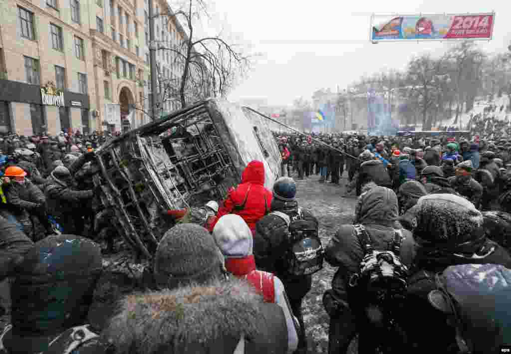 В центре Киева на улице Грушевского милиция сегодня утром оттеснила демонстрантов от первой линии возведённых ими баррикад и начала разбирать их. В ответ манифестанты забросали бойцов «Беркута» камнями и бутылками с зажигательной смесью, что заставило милицию отступить, сообщают информационные агентства.